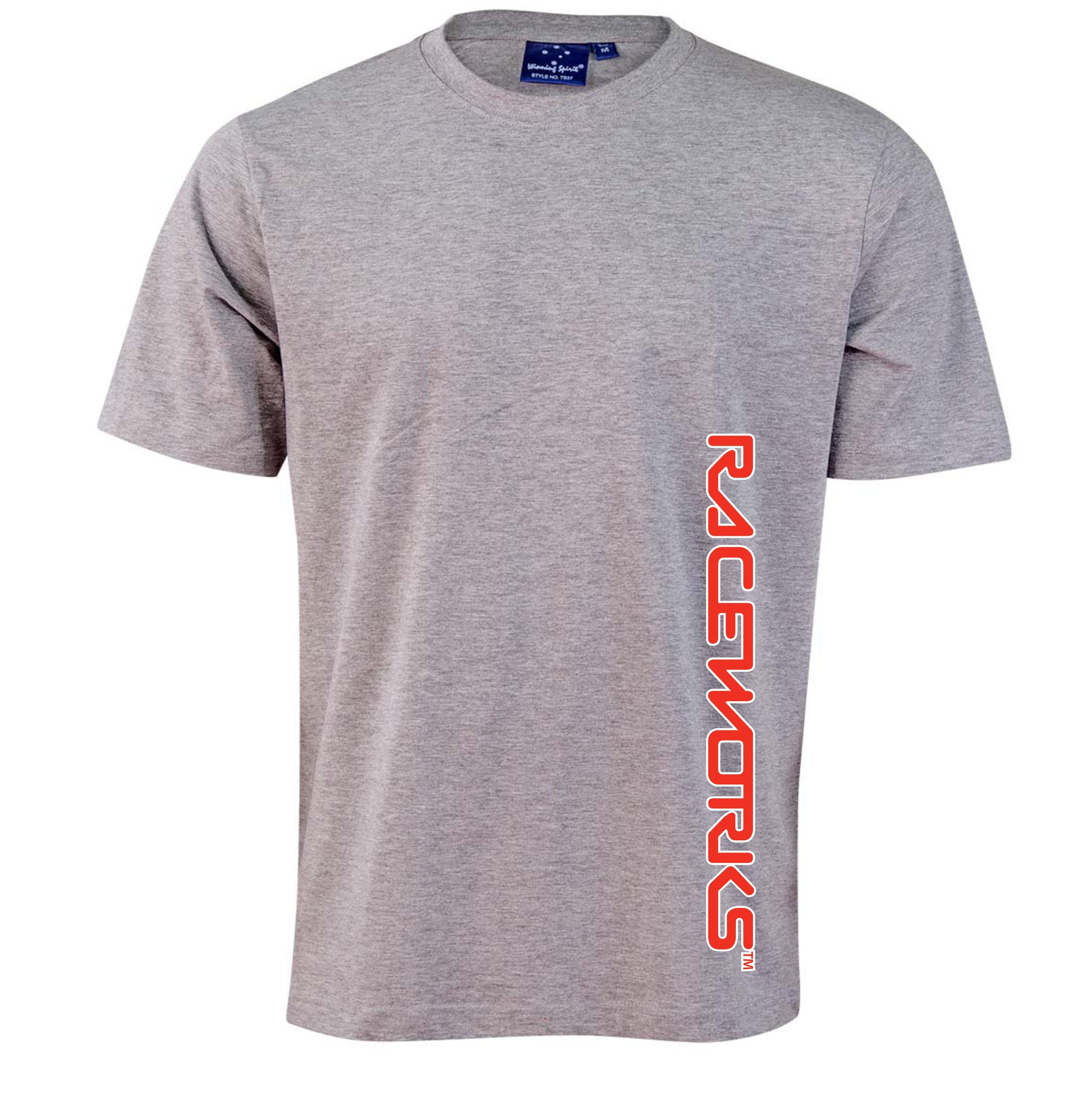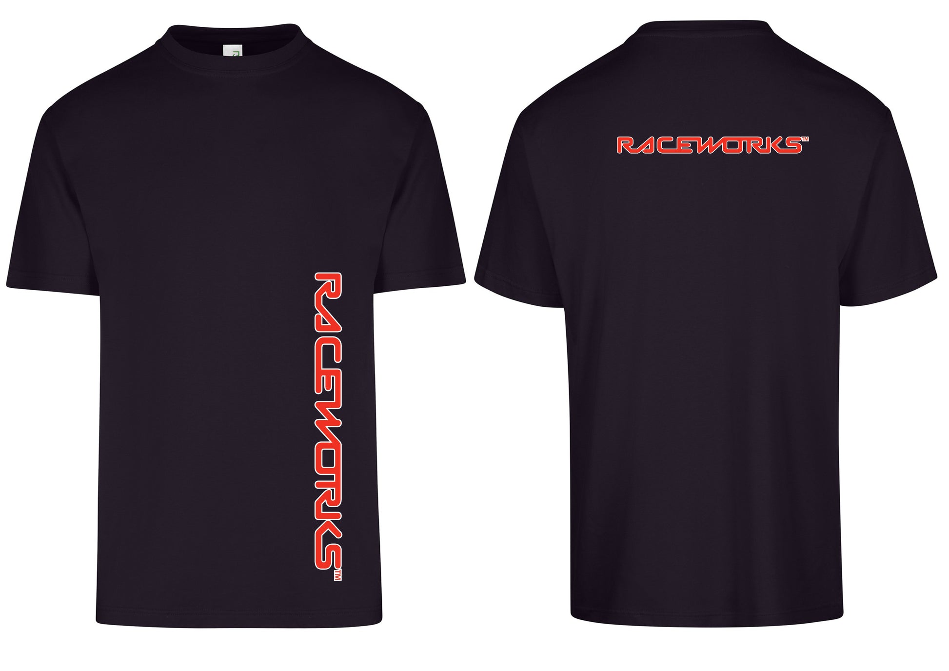 Black Tee contains Raceworks print on front and rear. Grey Tee contains Raceworks print on front only